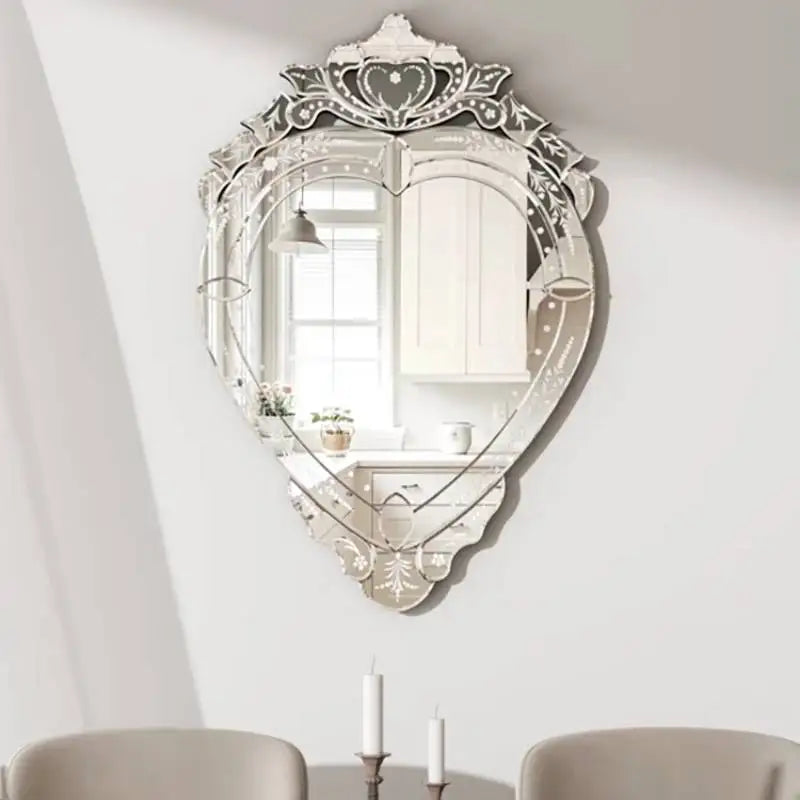 Designed as a visual centerpiece, this irregular wall vanity mirror brings European inspired elegance to bedrooms, dressing areas, and statement walls. The sculpted silhouette and carved detailing transform the mirror into wall art, ideal for romantic interiors, wedding aesthetics, or feminine spaces.
