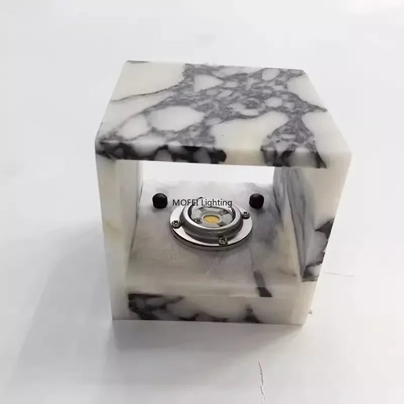 Each piece is cut from real marble, meaning no two lamps are ever the same. The natural veining diffuses light softly upward and downward, creating a refined glow ideal for entrance hallways, bedroom backgrounds, or statement corridors. The compact cube form delivers presence without visual clutter, making it a strong choice for modern interiors that value restraint and texture.